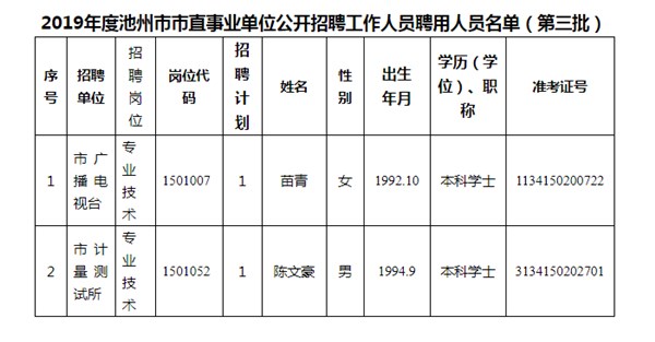 附件:2019年度池州市市直事业单位公开招聘工作人员聘用人员名单(第三批)