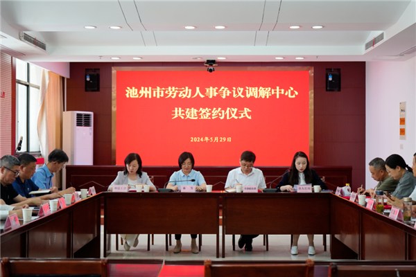 共建活动中,市人社局通报了全市劳动人事争议调解仲裁机构聚焦矛盾多元化解、健全风险监测预警、坚持和完善新时代“枫桥经验”等情况,市委政法委、市人社局等八家单位共同签署了《池州市劳动人事争议调解中心共建协议书》。